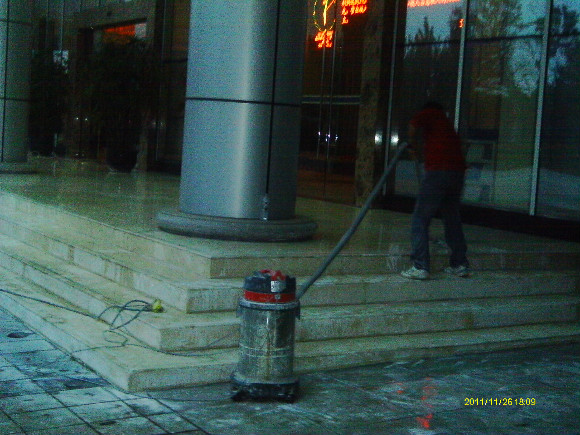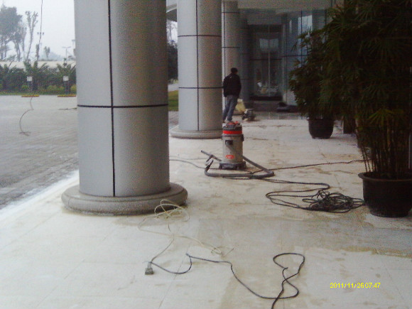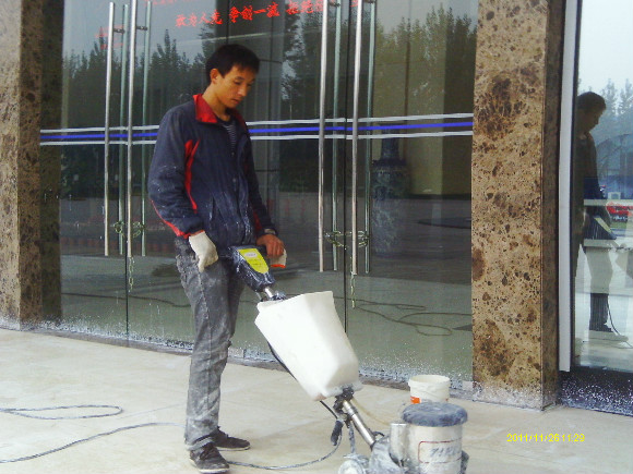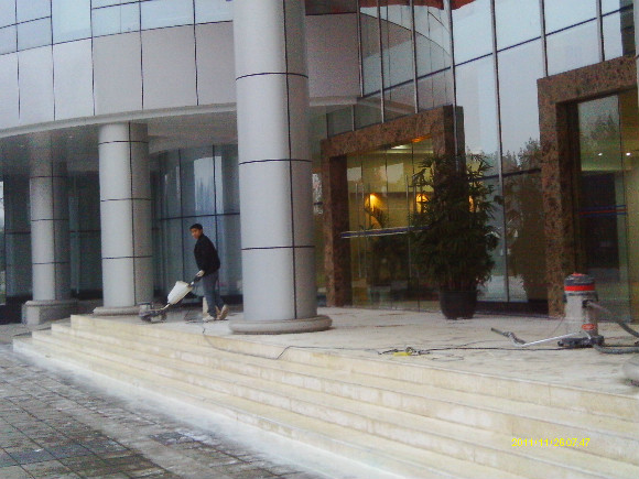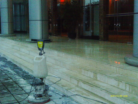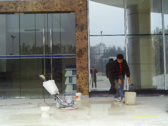 到了70年代末,一種可塑性水溶性結(jié)晶聚合物的誕生,亦即是現(xiàn)今常說的水蠟,進(jìn)化了石材護(hù)理的歷史,可以利用這種物質(zhì)對不同材質(zhì)的大理石進(jìn)行護(hù)理。分底蠟(封蠟),面蠟(拋光蠟)及保養(yǎng)蠟(日常修補(bǔ)蠟)是對大理石的塑層進(jìn)行保護(hù)并利用高速拋光來增亮,對石材的保護(hù)起到一定的作用。但是這種水蠟不足之處是蠟層的硬度有限,稍欠保養(yǎng),腳步帶進(jìn)的塵土將很容易把蠟層及石材磨花。同時(shí),遇上雨水季節(jié),因室外雨水塵埃會(huì)有一定的雜質(zhì),通過人的腳步帶進(jìn)后,對蠟層的分子組成將造成一定的影響。直觀看到是蠟層變黃及缺光澤,也就是以后常見到的許多客戶為什么須經(jīng)常將腐蝕的蠟層用起蠟水脫去,再重新分工序打上底蠟和面蠟,每次的工作量及耗用的物料較大,這種工藝現(xiàn)市場上很普通,我們稱為石材打蠟第二代。